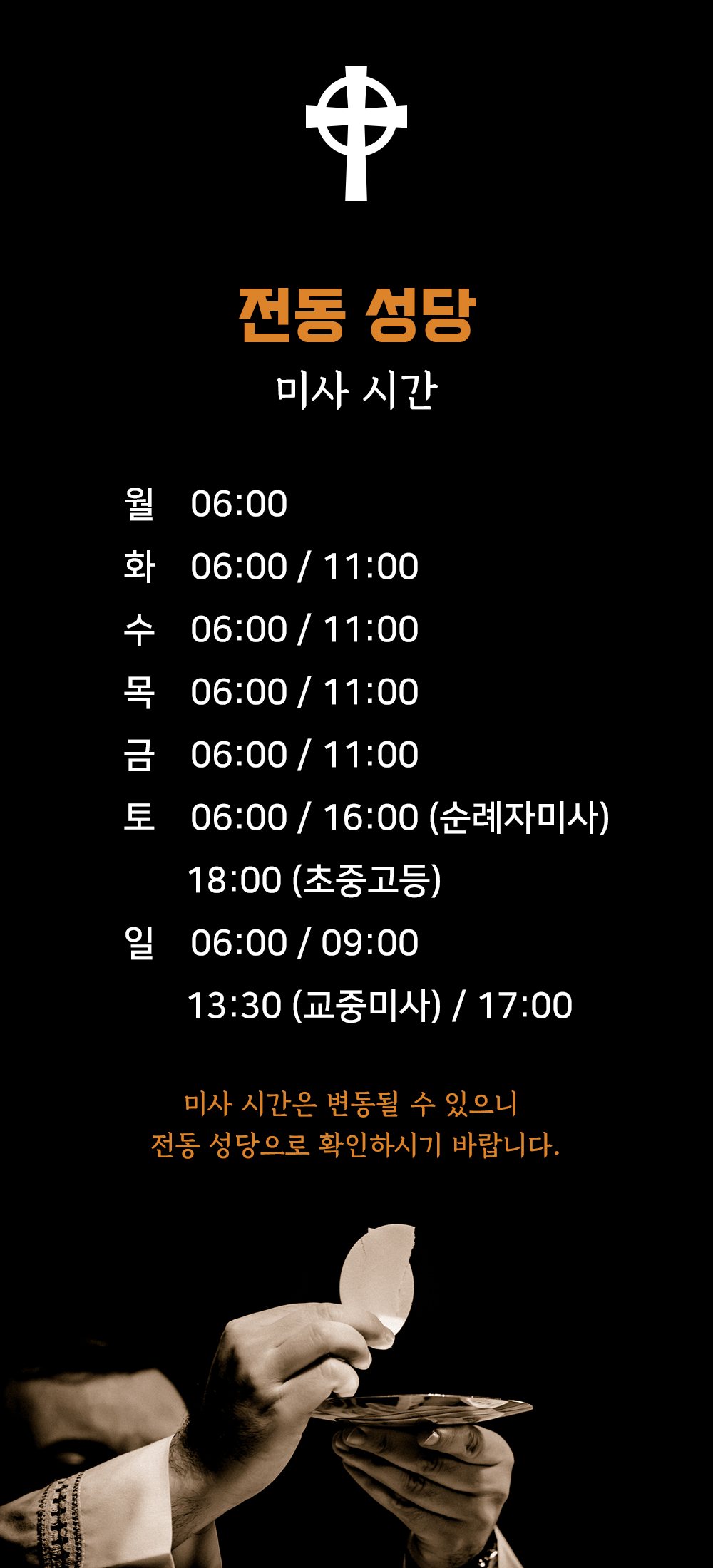 미사 시간은 변동될 수 있으니 전동성당 (063-284-3222)으로 확인하시기 바랍니다. 전화번호를 클릭하면 전동성당으로 연결됩니다.