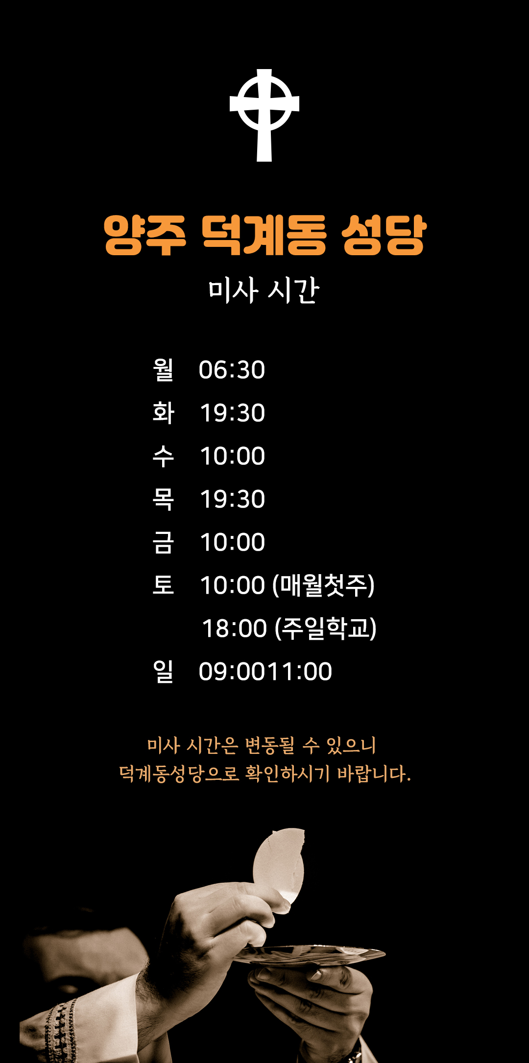 미사 시간은 변동될 수 있으니 덕계동 성당 (031-857-1695)으로 확인하시기 바랍니다. 전화번호를 클릭하면 양주 덕계동성당으로 연결됩니다.