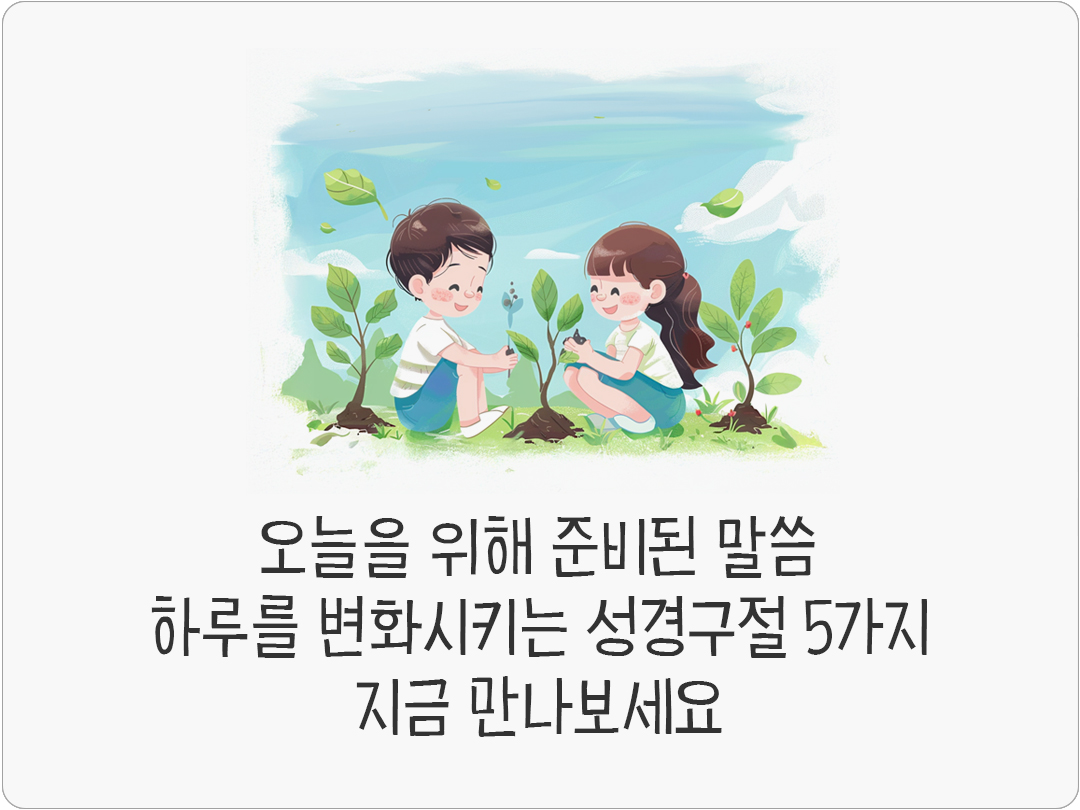 성경 말씀은 단순한 문장이 아니라 삶을 비추는 빛이 되어 하루를 변화시키는 힘이 있어요. 말씀 한 구절이 오늘을 새롭게 하고 큰 기적을 이끌어냅니다. 하루를 변화시키는 성경구절 5가지, 지금 만나보세요! 한 말씀이 오늘을 바꾸는 기적이 되기를 빕니다.