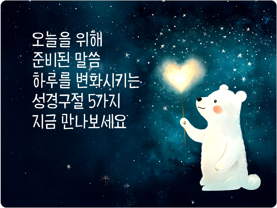 성경 말씀은 단순한 문장이 아니라 삶을 비추는 빛이 되어 하루를 변화시키는 힘이 있어요. 말씀 한 구절이 오늘을 새롭게 하고 큰 기적을 이끌어냅니다. 하루를 변화시키는 성경구절 5가지, 지금 만나보세요! 한 말씀이 오늘을 바꾸는 기적이 되기를 빕니다.