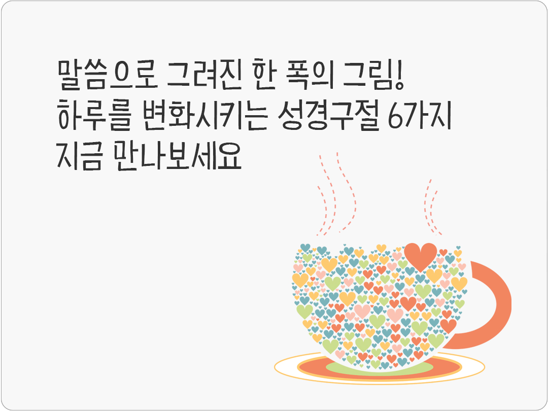 성경 말씀은 단순한 문장이 아니라 삶을 비추는 빛이 되어 하루를 변화시키는 힘이 있어요. 말씀 한 구절이 오늘을 새롭게 하고 큰 기적을 이끌어냅니다. 오늘을 위해 준비된 말씀, 하루를 변화시키는 성경구절 6가지 지금 만나보세요! 한 폭의 그림처럼 그려진 6가지 말씀이 평화가 되기를 빕니다.