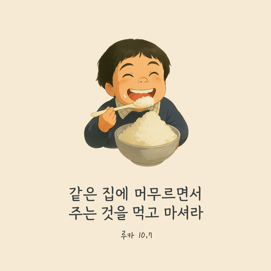 7 같은 집에 머무르면서 주는 것을 먹고 마셔라. 일꾼이 품삯을 받는 것은 당연하다. 이 집 저 집으로 옮겨 다니지 마라.