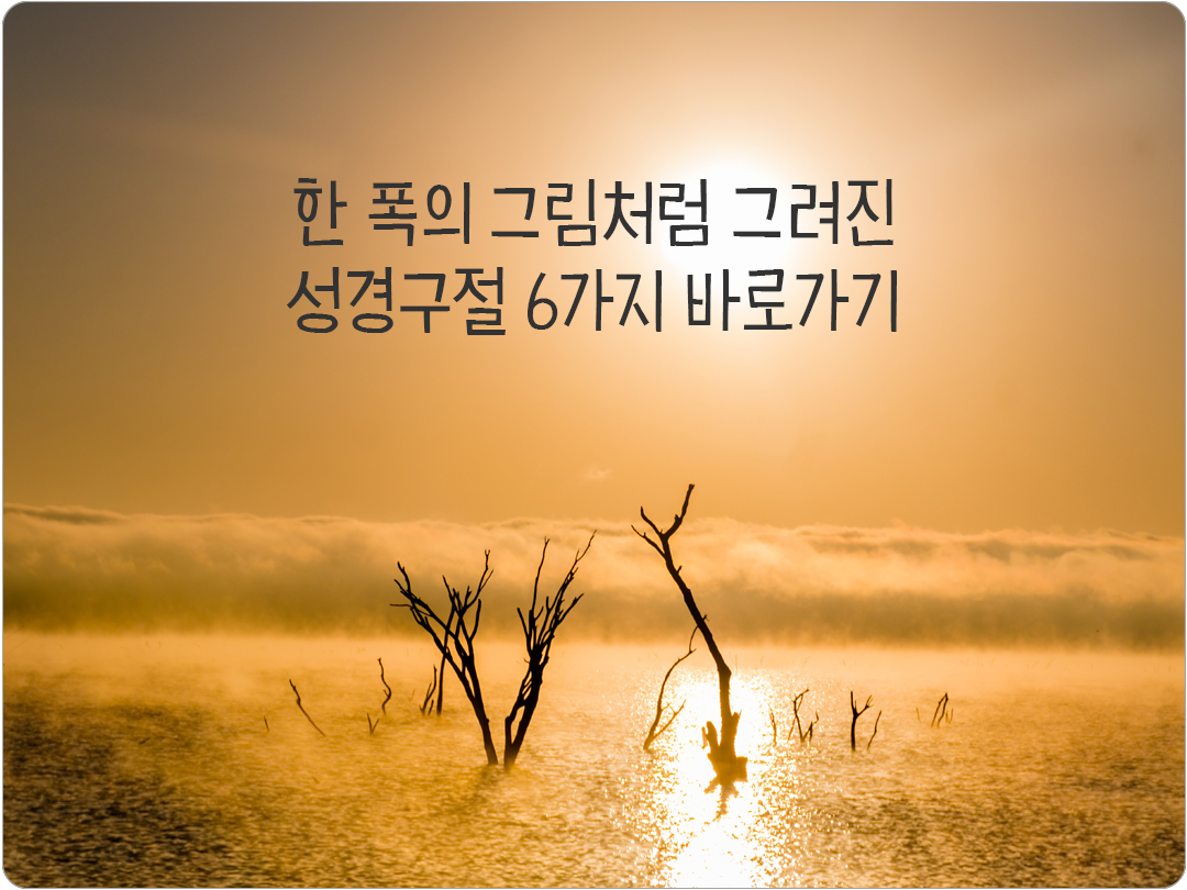 말씀 한 구절이 하루를 새롭게 하고 마음을 위로해주며, 때로는 예상치 못한 기적을 이끌어냅니다. 오늘을 위해 한 폭의 그림처럼 그려진 6가지 성경구절 지금 바로 만나보세요!