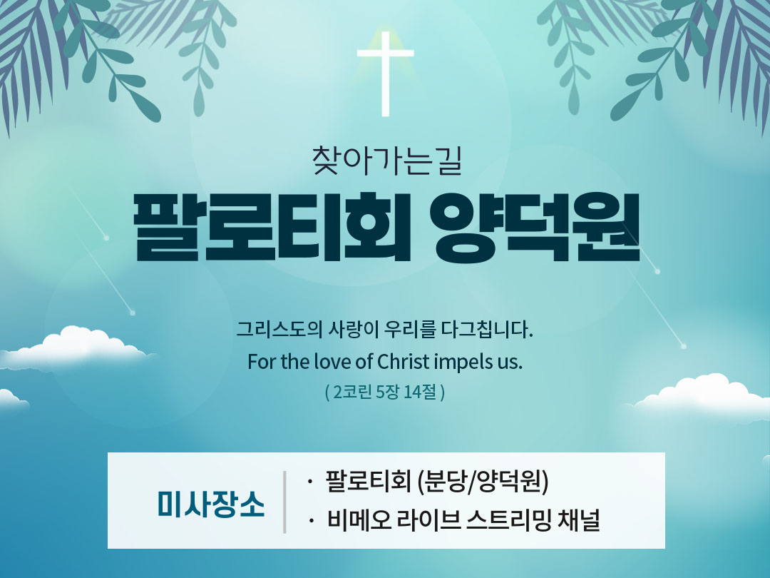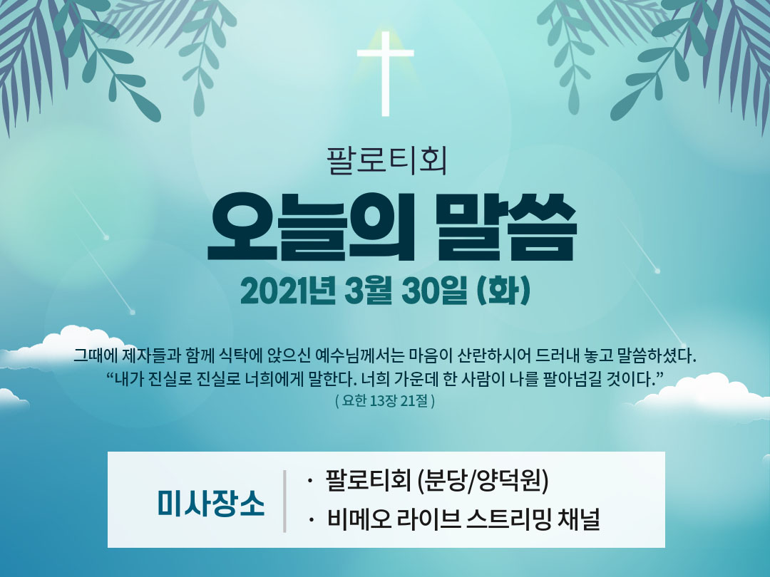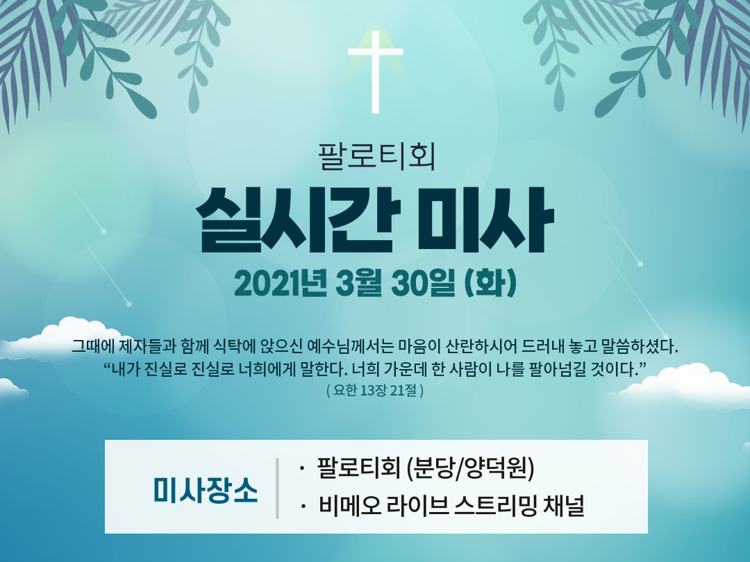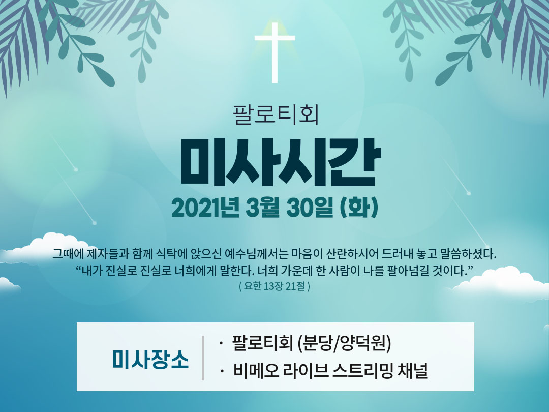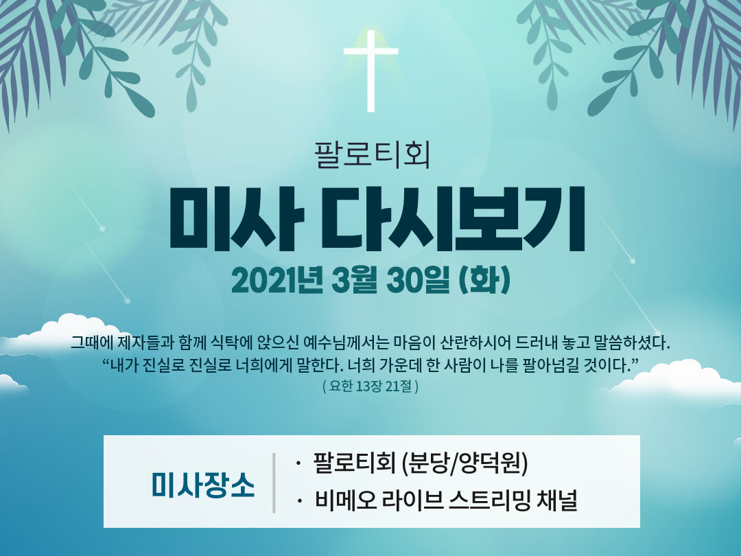 2021년 3월 30일 (화) 팔로티회 분당과 양덕원 미사시간을 공유합니다. 아래 미사시간을 클릭하면 해당 시간의 팔로티회 온라인 미사 다시보기로 이동합니다.