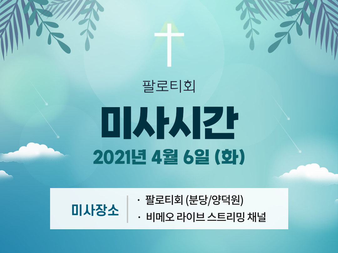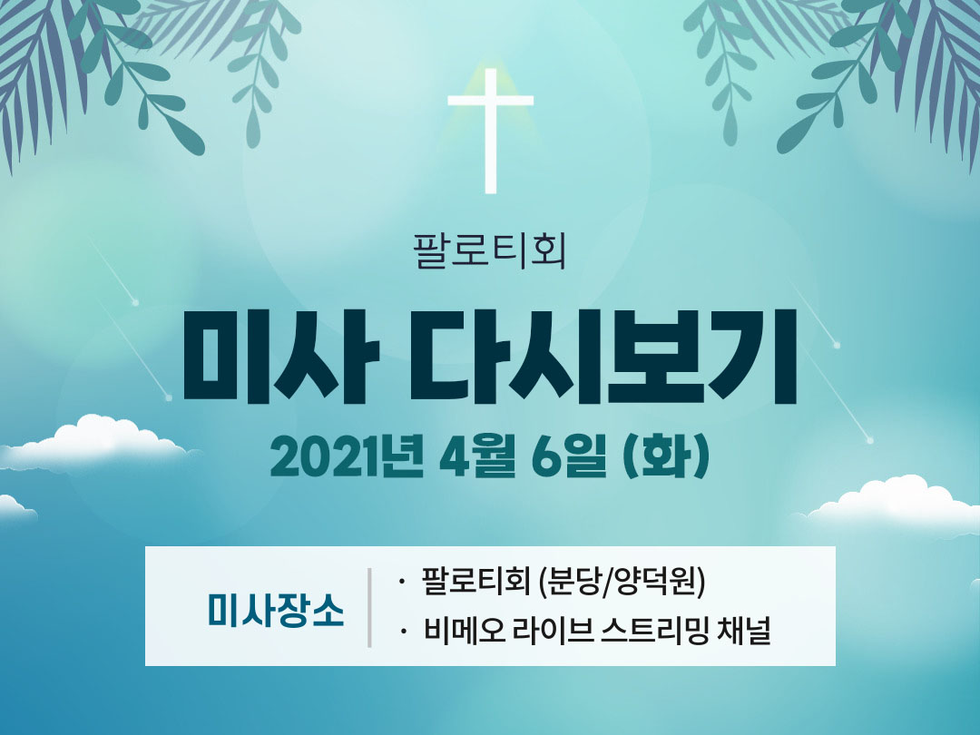 2021년 4월 6일 (화) 팔로티회 분당과 양덕원 미사시간을 공유합니다. 아래 미사시간을 클릭하면 해당 시간의 팔로티회 온라인 미사 다시보기로 이동합니다.