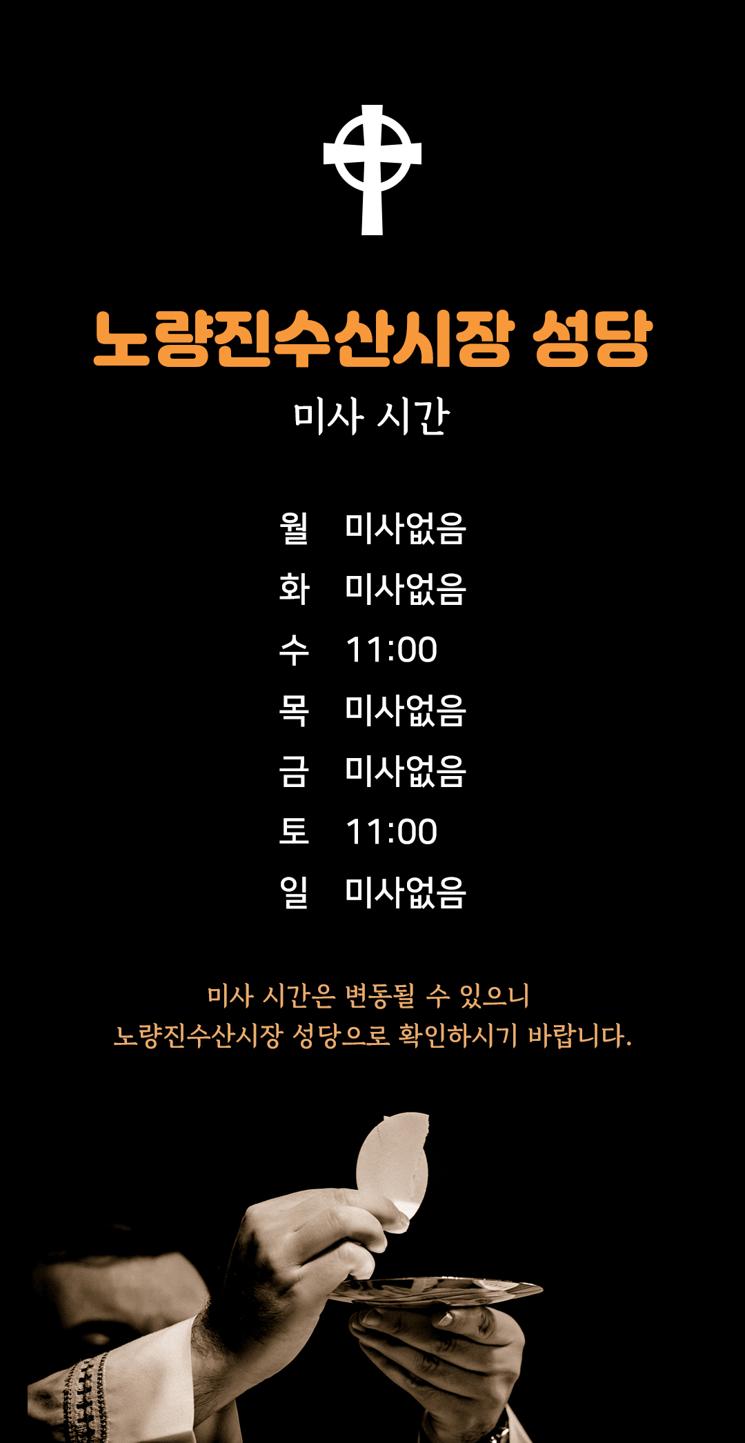 미사 시간은 변동될 수 있으니 노량진수산시장 성당 (02-813-6073)으로 확인하시기 바랍니다. 전화번호를 클릭하면 노량진수산시장성당으로 연결됩니다.