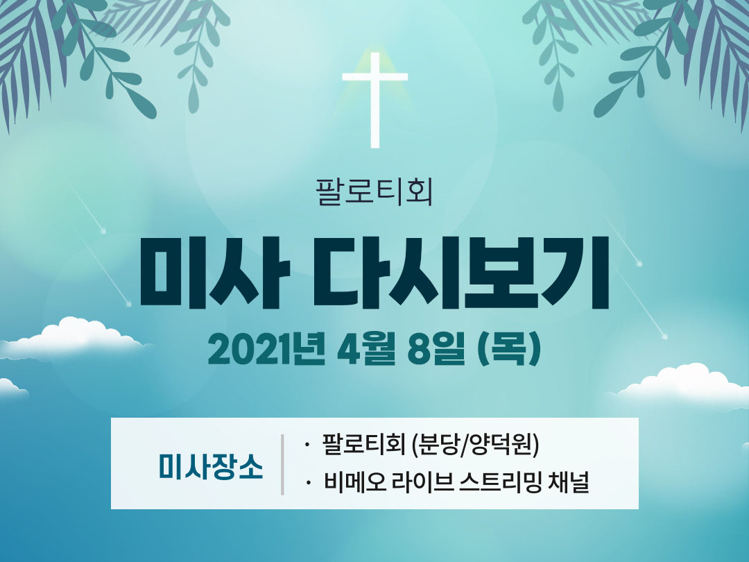 2021년 4월 8일 (목) 팔로티회 분당과 양덕원 미사시간을 공유합니다. 아래 미사시간을 클릭하면 해당 시간의 팔로티회 온라인 미사 다시보기로 이동합니다.