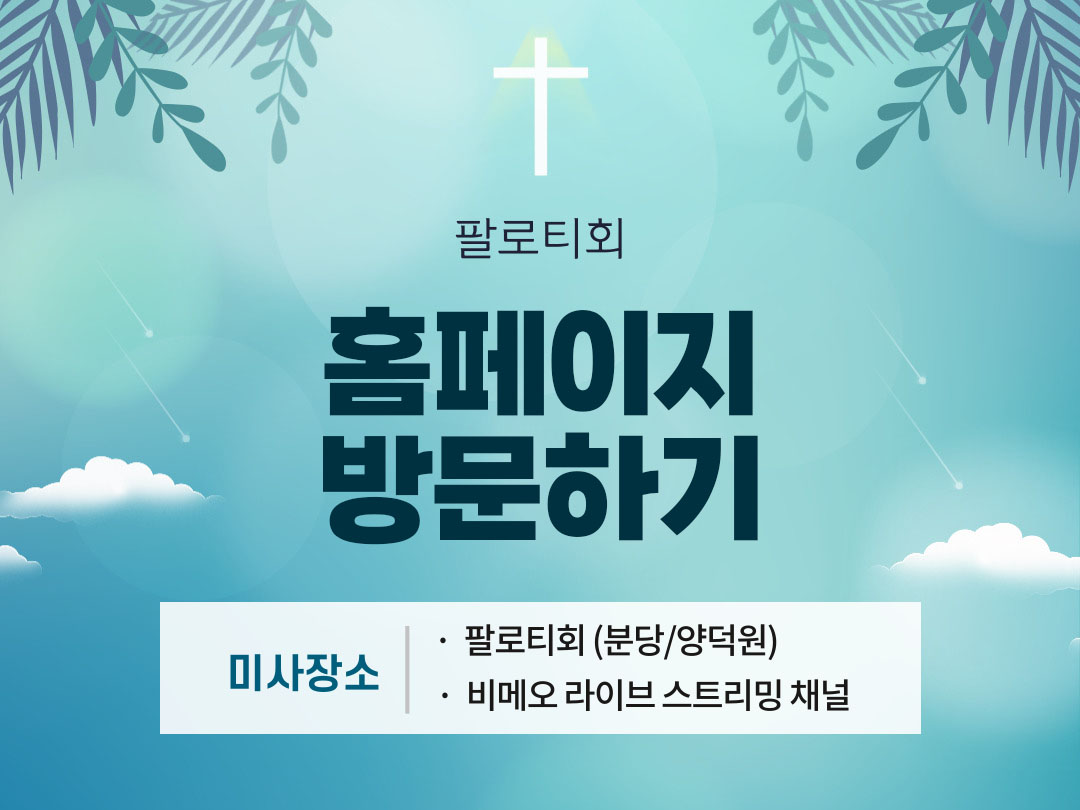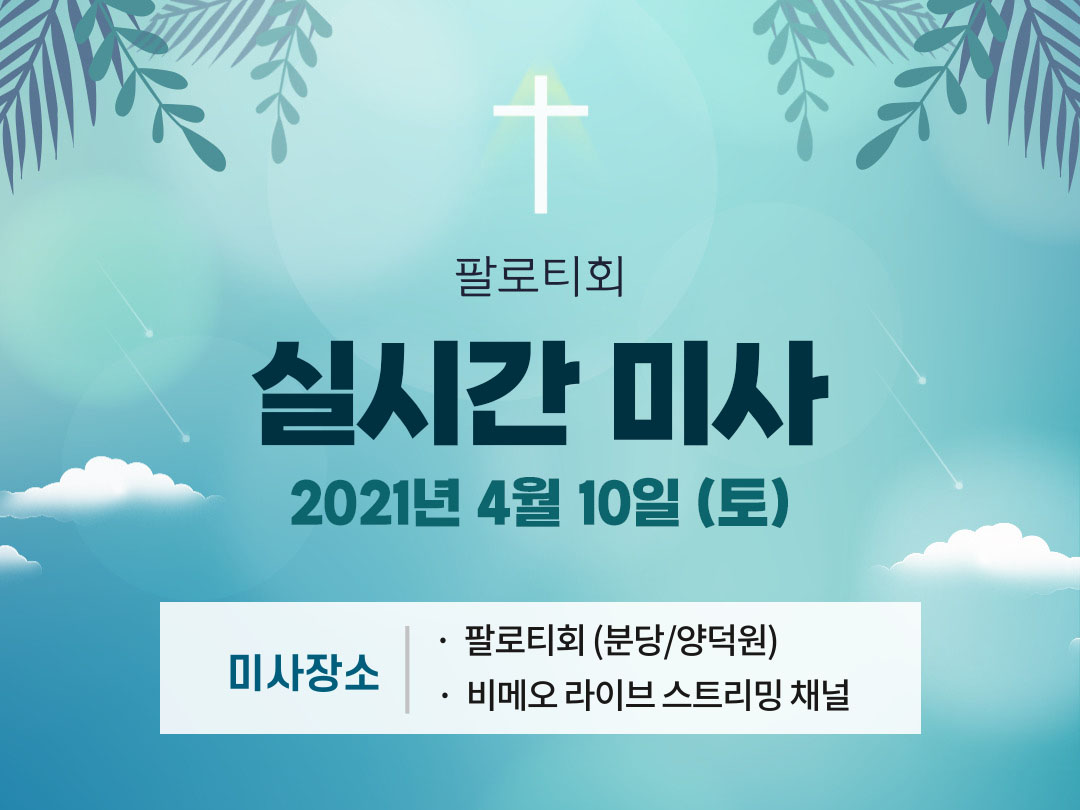 2021년 4월 10일 (토) 팔로티회 분당과 양덕원 미사시간을 공유합니다. 아래 미사시간을 클릭하면 해당 시간의 팔로티회 온라인 미사 다시보기로 이동합니다.